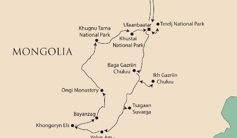 Ulaanbaatar–Baga Gazriin Chuluu–Tsagaan Suvraga–Dalanzadgad–Yolyn Am–Khongoryn Els–Bayanzag–Manastirea Ongini–Karakorum–Ulaanbaatar